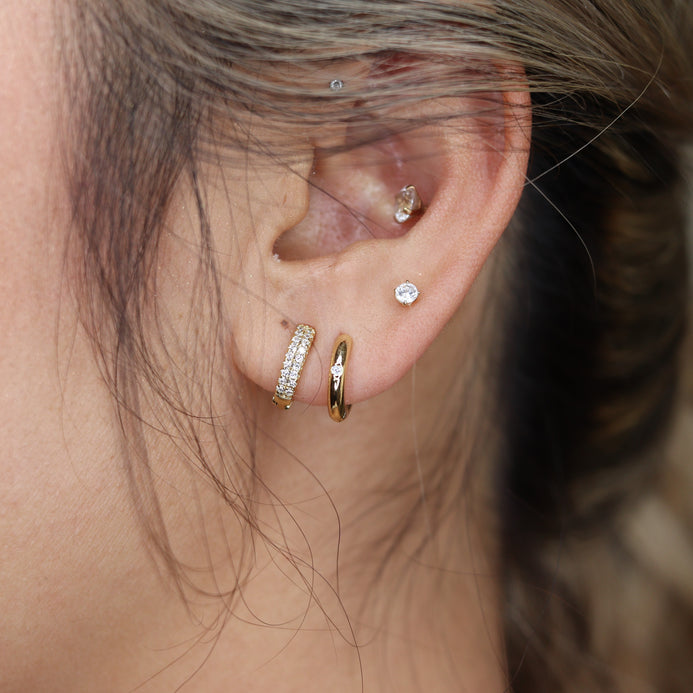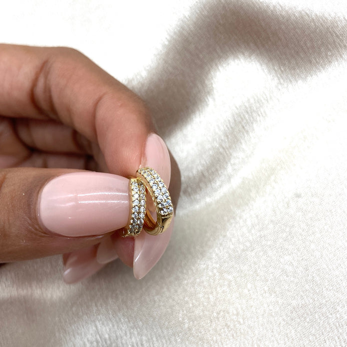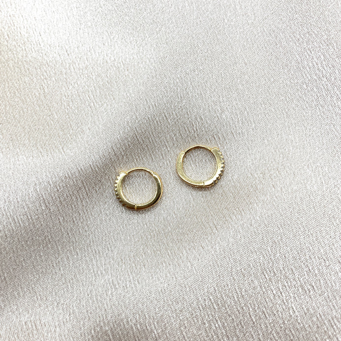 They are 14K Gold Filled and the front size is covered with CZ diamonds. The size is 12MM.